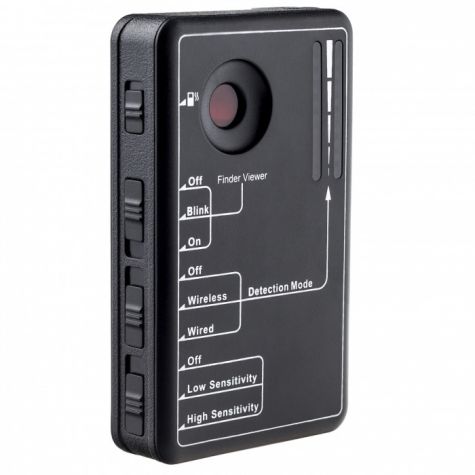- K vyhledávání minikamer, které nevysílají vlastní signál a mají vlastní paměť pro záznam slouží druhý mód detektoru. Pomocí červeného sklíčka se Vám podaří čočku této kamery vyhledat. Tato metoda je časově náročnější než vyhledávání odposlechů či jiných zařízení, které vydávají bezdrátový signál.